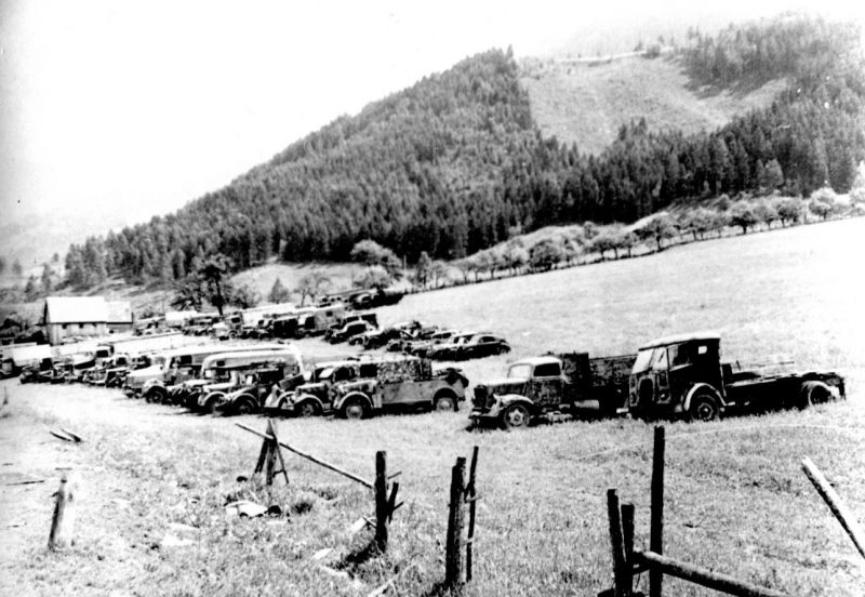 На фотографии: Сборный пункт немецкой автотехники в Австрии (предположительно, в районе города Грац). Австрия, 1945 год.