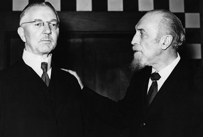 На фотографии: германский государственный и финансовый деятель, директор Национального Банка Германии, президент Рейхсбанка, рейхсминистр экономики, рейхсминистр без портфеля Шахт и глава Банка Англии Монтегю Норман. Германия, дата фотографии неизвестна.