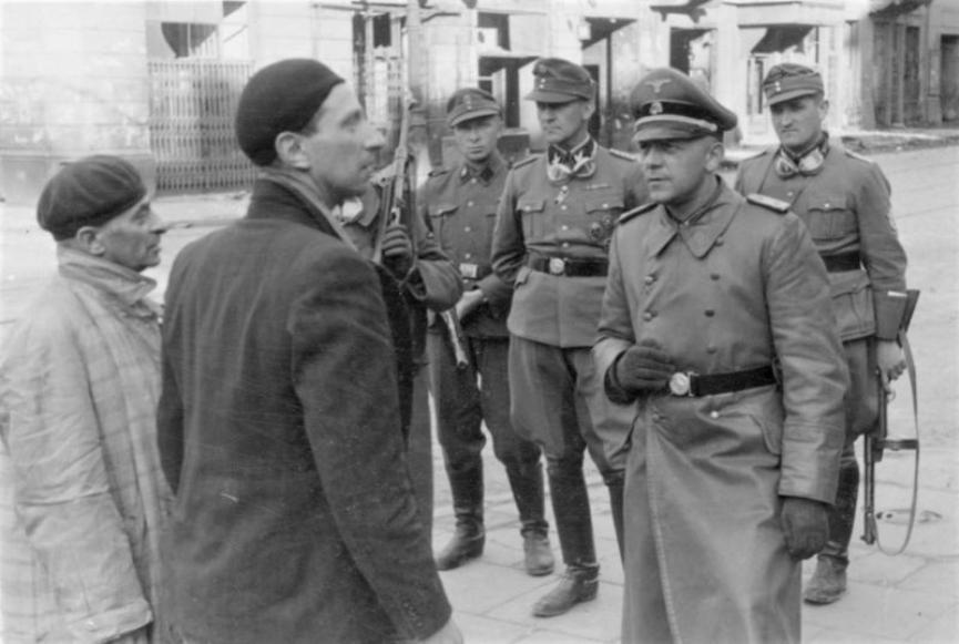 На фотографии: офицеры СС беседуют с евреями во время подавления восстания в варшавском гетто. Польша, 1943 год.